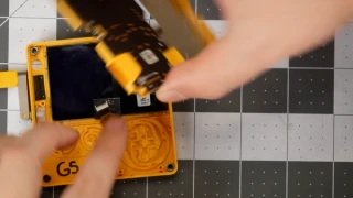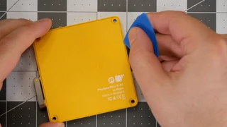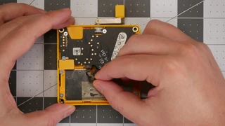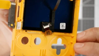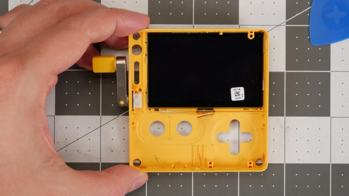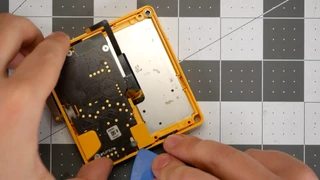 - Insert a plastic pick at the bottom, and gently tilt it down toward the Playdate to begin removing the mid-frame. Be very mindful of the power button at this point, pushing it out and guiding the display connector FFC while you lift the mid-frame up and away.