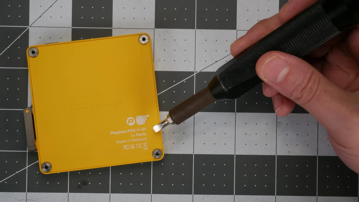 - Use a 4mm flathead screwdriver to remove the corner screws on the back of your Playdate. These screw heads are easy to strip or mar, so be careful!