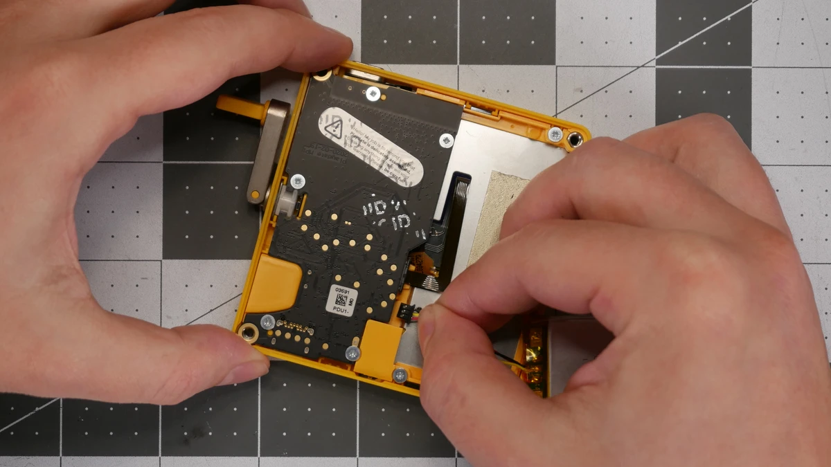 - Use precision tweezers to remove the warranty warning sticker, and guide the battery wires into an accessible position. Firmly grasp all three wires and pull/wiggle to disconnect the battery from your Playdate's mainboard.